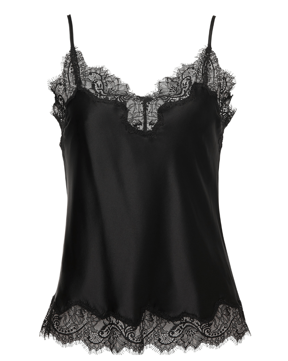 Enter the world of luxury with the Sainted Sisters Camisole. This exquisite piece is crafted with a soft black fabric and trimmed with a delicate lace edge for a stylishly alluring finish. Elevate any look with an understatedly elegant touch.